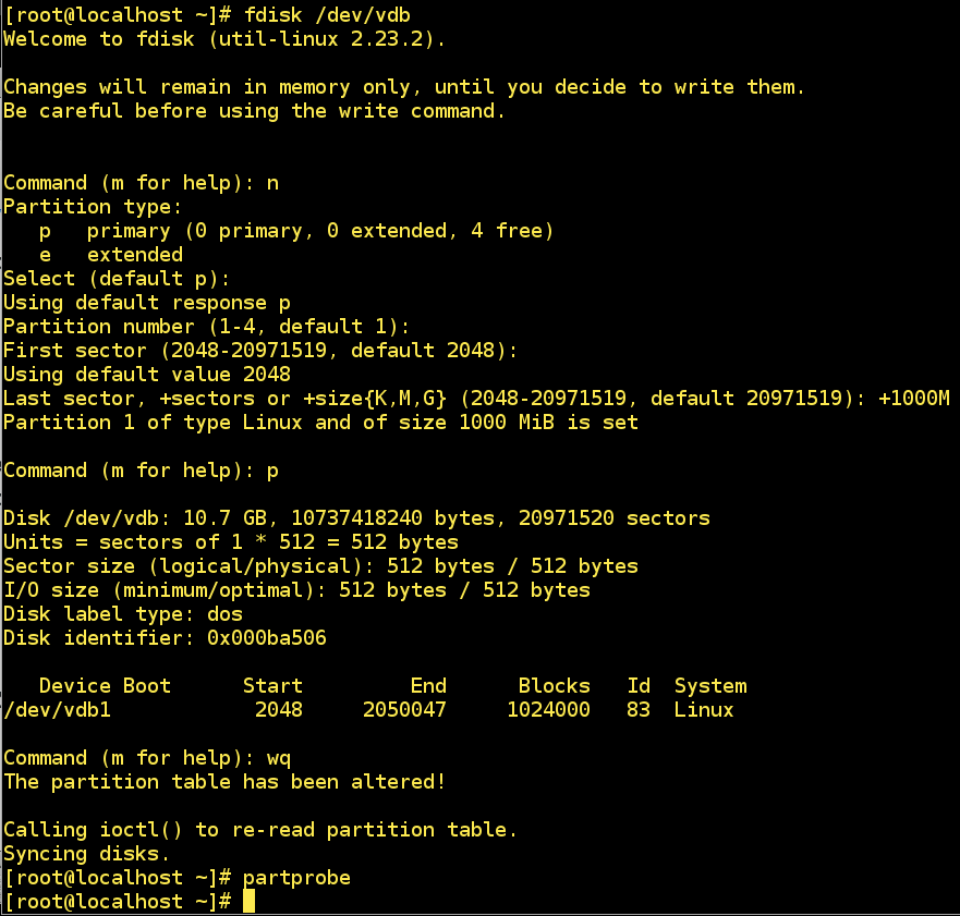 建立一个dos类型,大小为100M的主分区(设备/dev/vdb1)