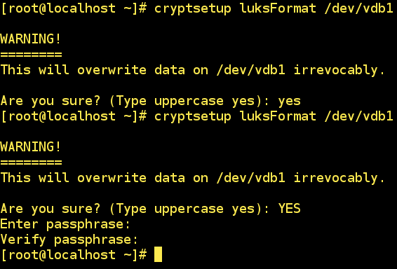 [root@localhost ~]# cryptsetup luksFormat /dev/vdb1