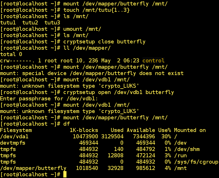 [root@localhost ~]# cryptsetup open /dev/vdb1 butterfly
