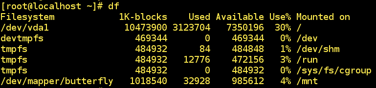 [root@localhost ~]# mount /dev/mapper/butterfly /mnt/