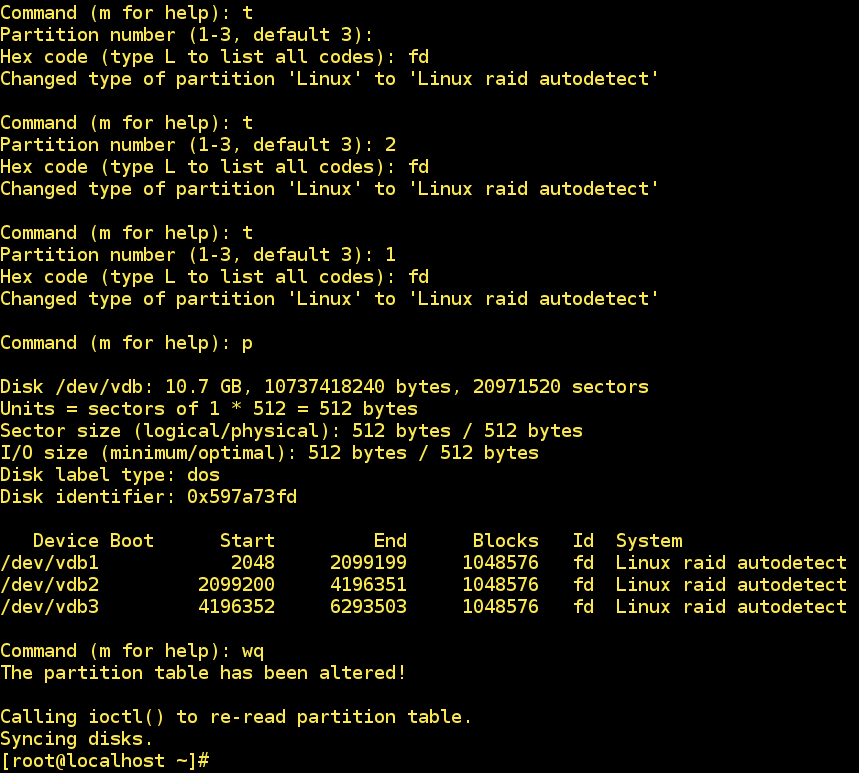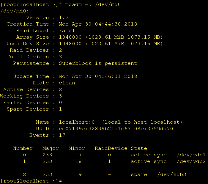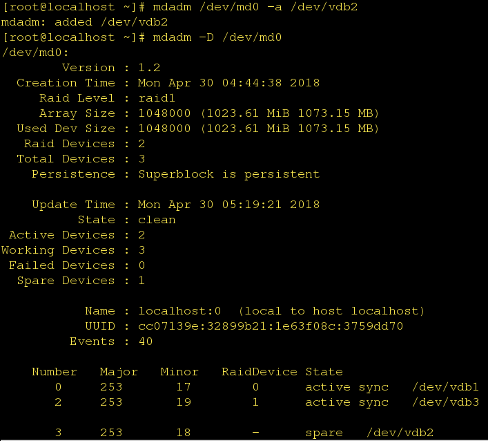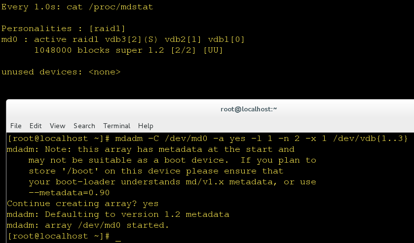 mdadm -C /dev/md0 -a yes -l 1 -n 2 -x 1 /dev/vdb{1..3}