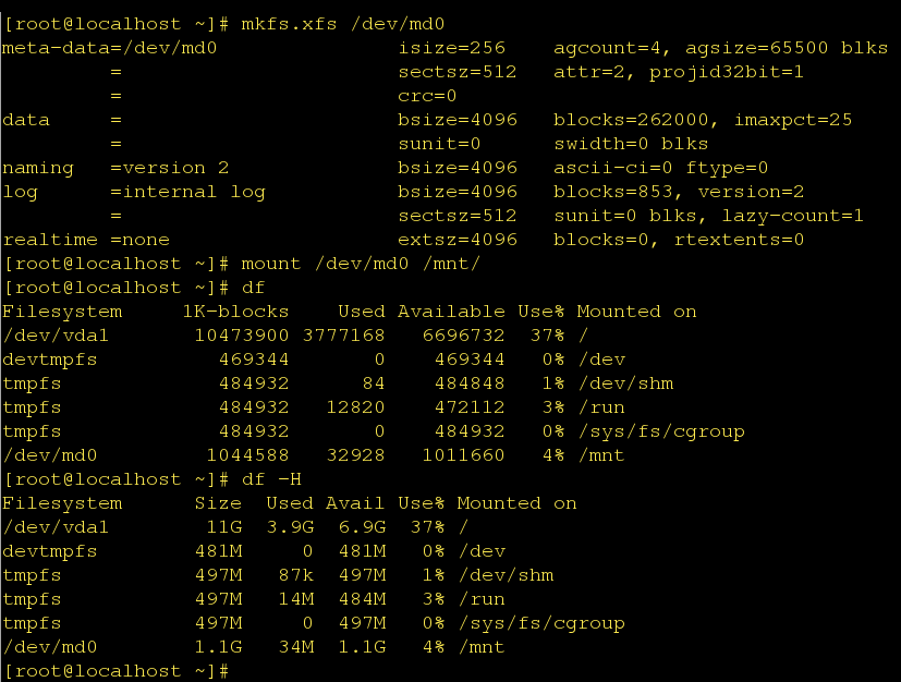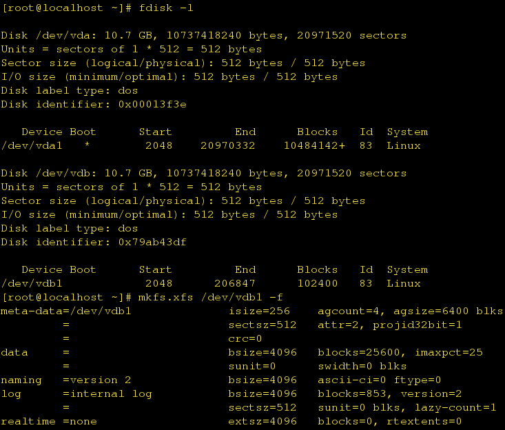 [root@localhost ~]# mkfs.xfs /dev/vdb1