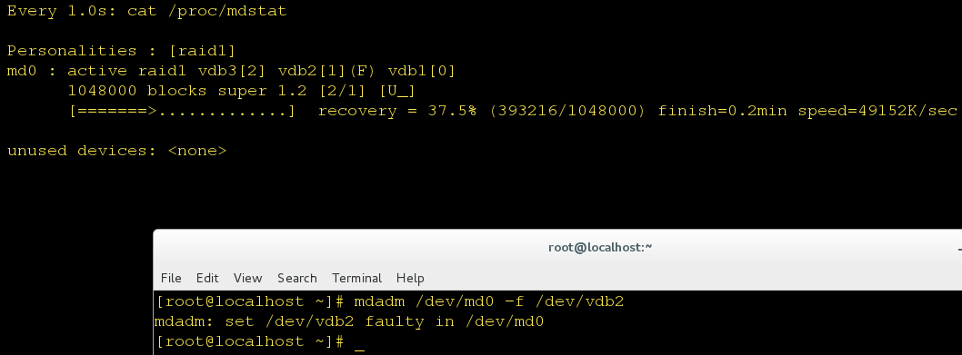 mdadm -f /dev/md0 /dev/vdb1 #强制损坏