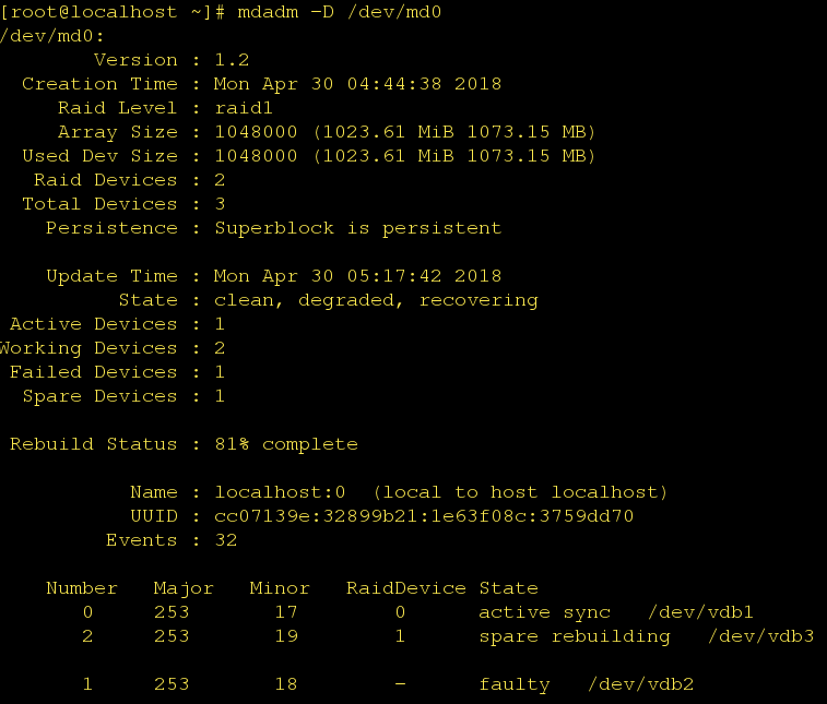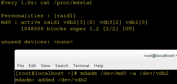mdadm -a /dev/md0 /dev/vdb1 #重新加入