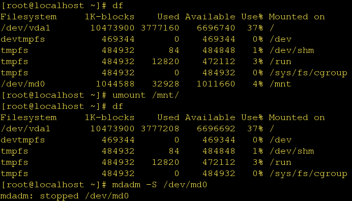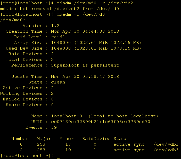mdadm -r /dev/md0 /dev/vdb1 #删除