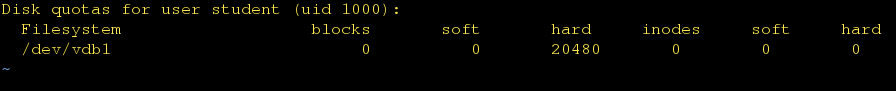 quotaon -uv /dev/vdb1 ##激活配额,-u检测用户,-v显示设备,针对ext的设备