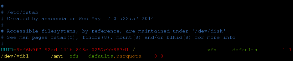 UUID=9bf6b9f7-92ad-441b-848e-0257cbb883d1 / xfs defaults 1 1 ##文件本身存在