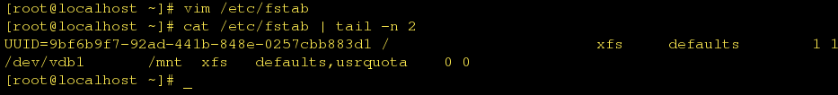 [root@localhost ~]# cat /etc/fstab | tail -n 2