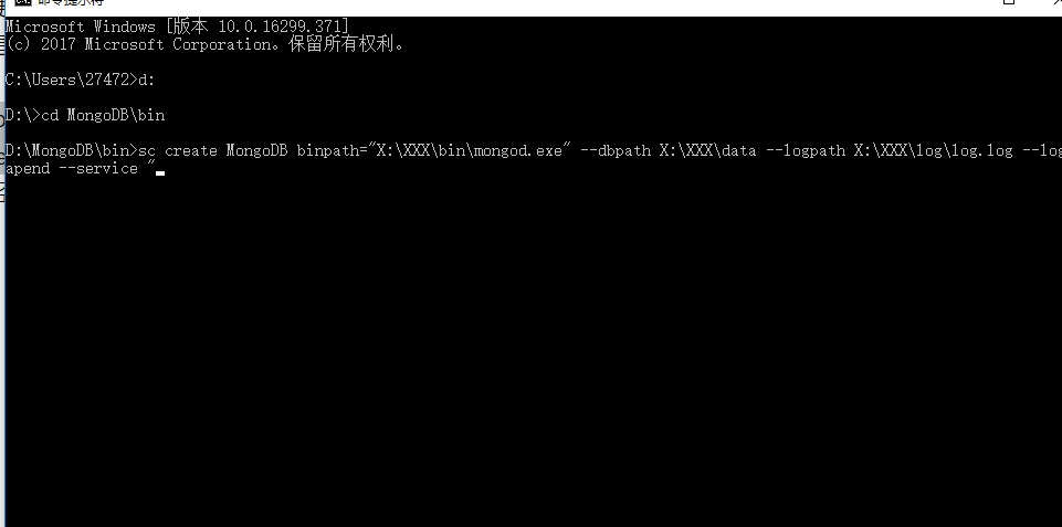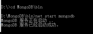 1. 输出上面信息表面已经安装成功了。但是我们都是以windows服务来启动的,这样以后用起来方便点。那么现在先关闭这个cmd命令窗口,再以管理员方式打开一个新的cmd命令窗口。还是先定位到MongoDB安装目录的bin文件夹下面。以服务方式启动的时候我们需要指定它的日志路径。输入安装服务的命令如下:sc create MongoDB binpath=”X:\XXX\bin\mongod.exe” --dbpath X:\XXX\data --logpath X:\XXX\log\log.log --logapend --service “(X:\XXX为mongodb的安装目录)。--dbpath指的是数据库的路径,就是刚刚新建的data路径, --logpath指的是日志文件的路径,刚刚新建的log.log文件。