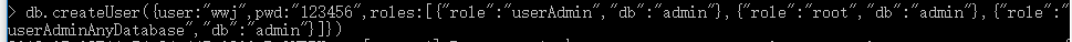3. 新建用户 db.createUser({user:”账号”,pwd:”密码”,roles:[{“role”:”userAdmin”,”db”:”admin”},{“role”:”root”,”db”:”admin”},{“role”:”userAdminAnyDatabase”,”db”:”admin”}]})