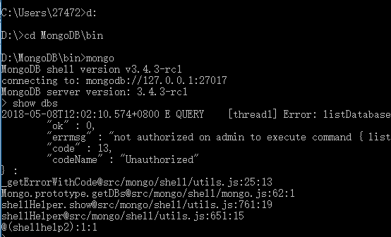 9. 发现无权限操作,因为我们没有用有权限的账号登陆。 输入exit退出,然后接着输入 mongo -u 账号 -p 密码 localhost:27017/admin (连远程就把localhost换成远程的ip)