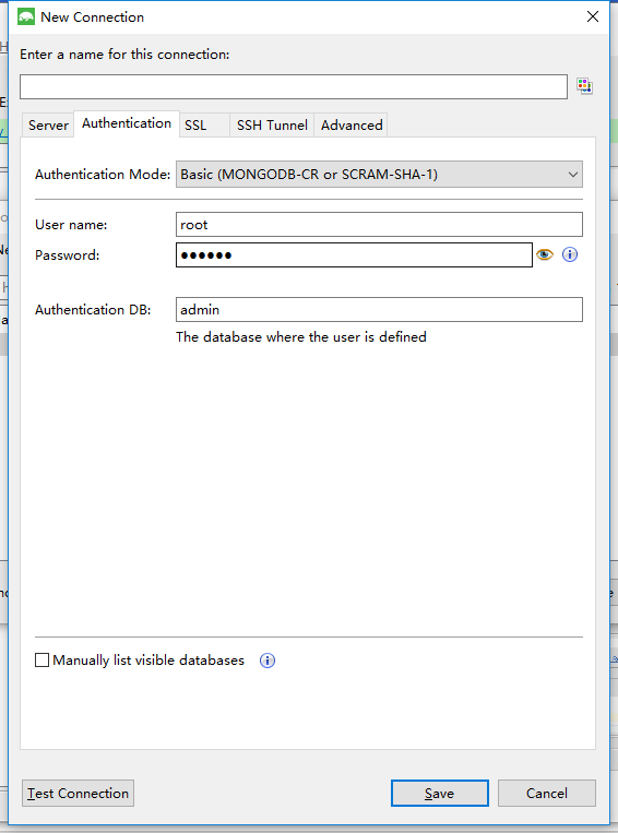 3. 输入有权限的账号密码即可,只有超级用户才会在admin数据库中。然后save