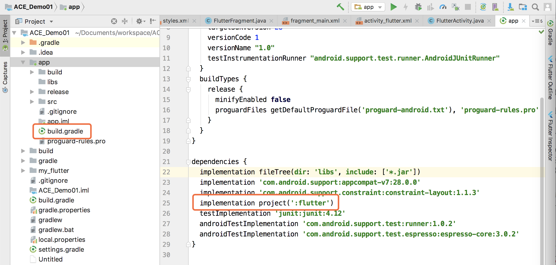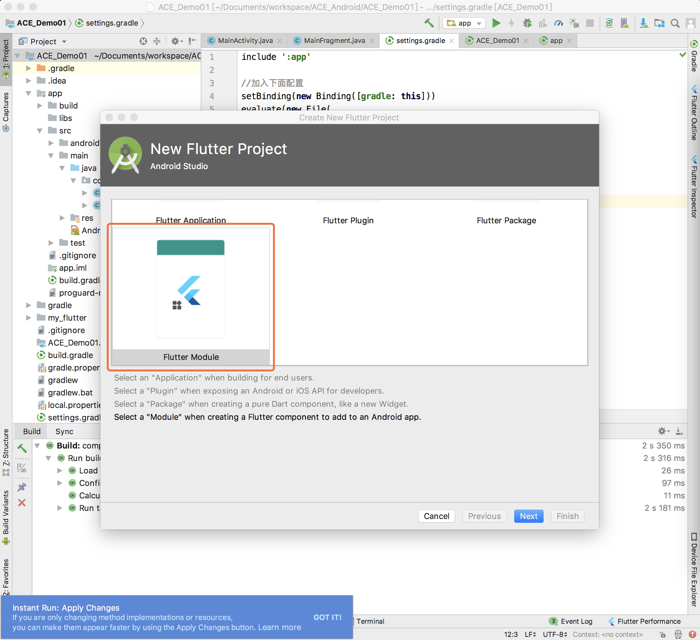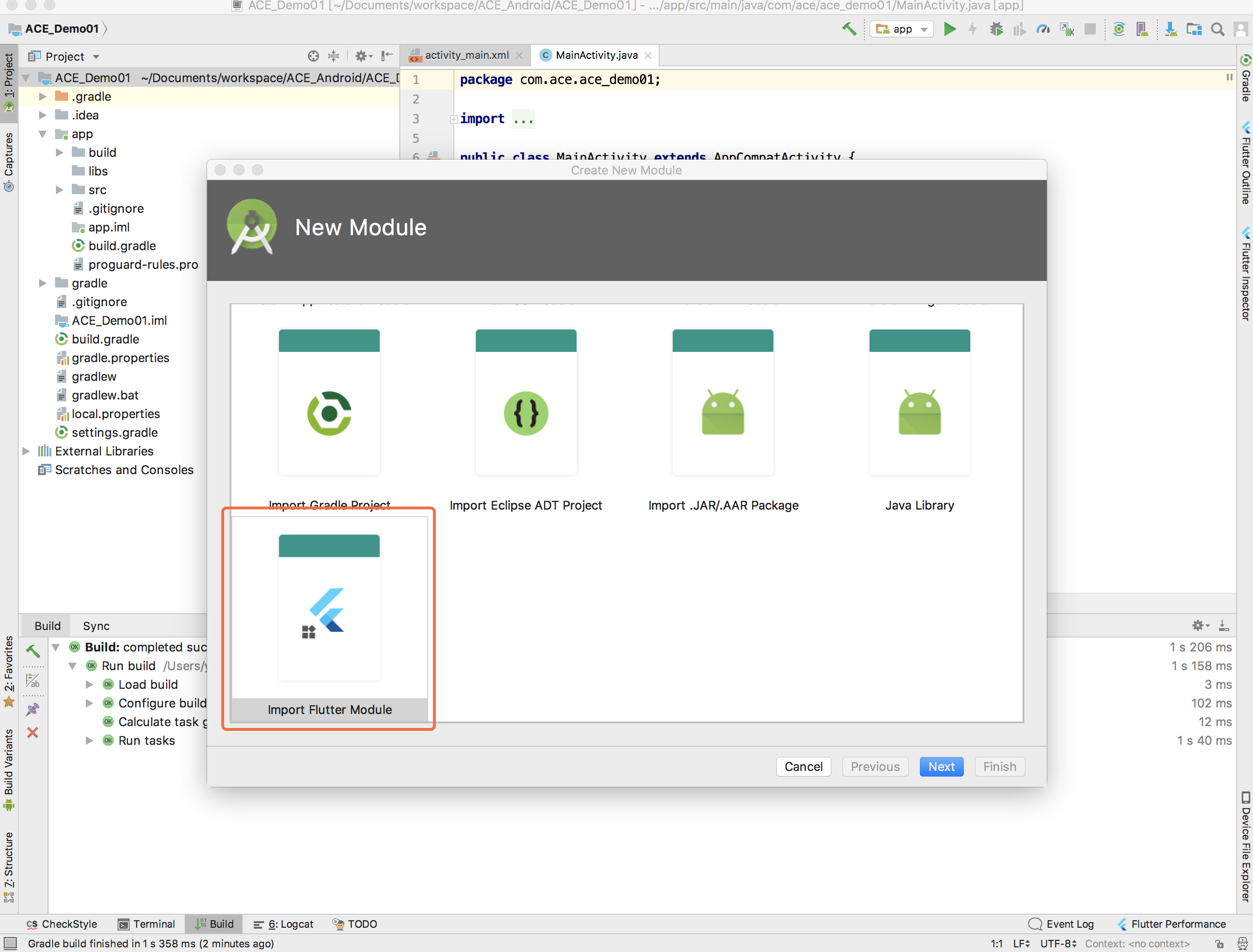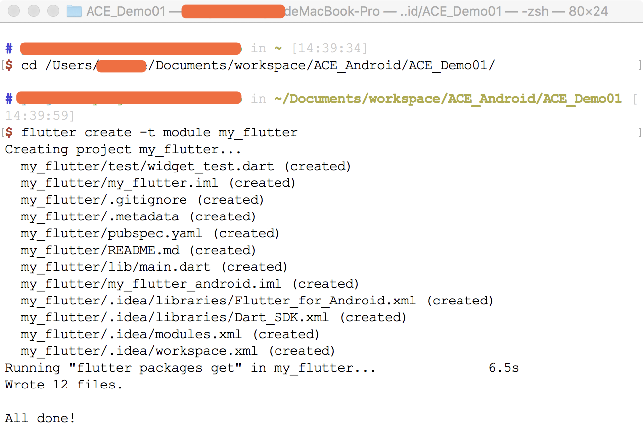 小菜首先采用如下命令行新建一个 Flutter Module,此时本地路径为 …/ACE_Android 与 ACE_Demo01 同级;
