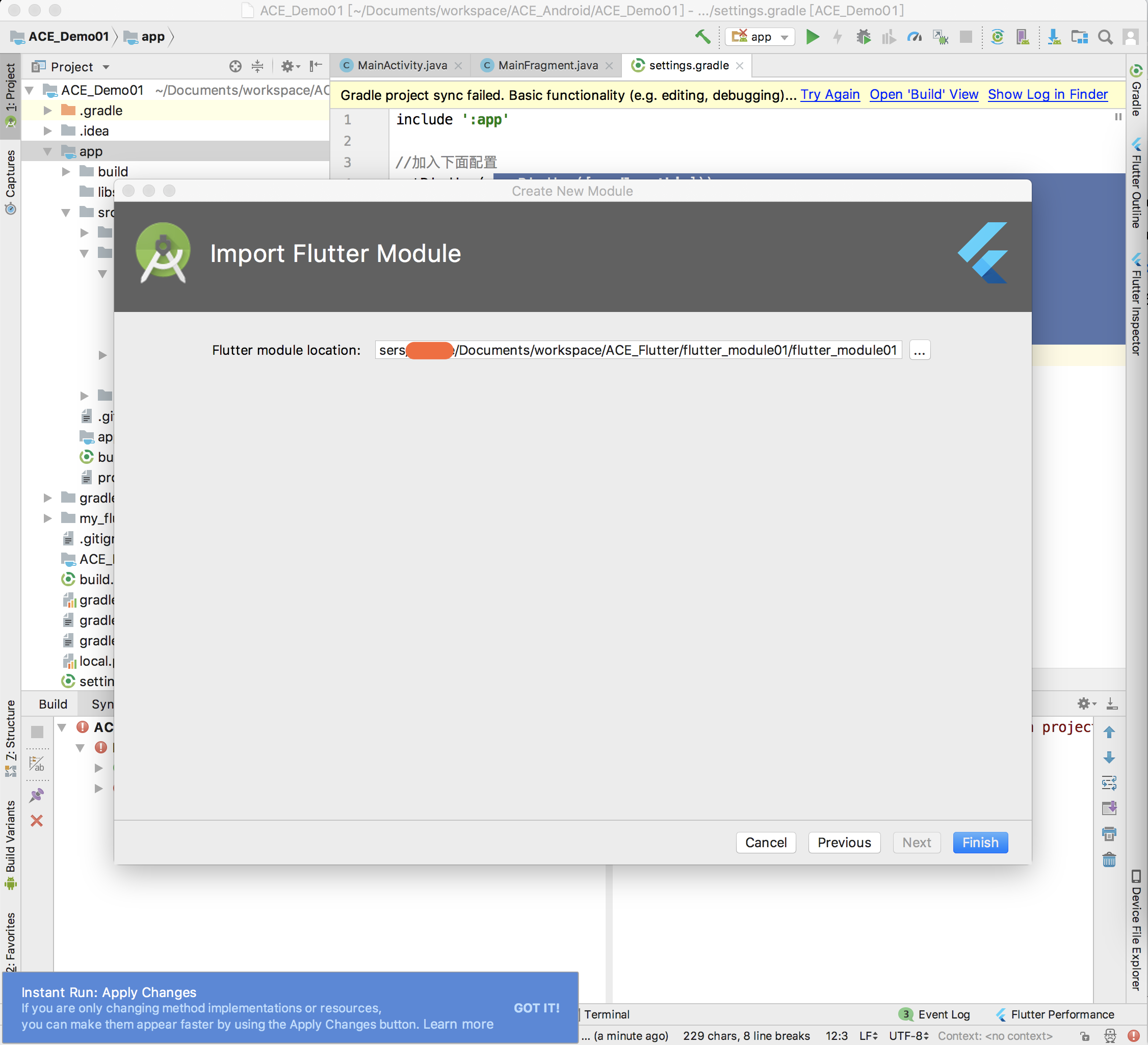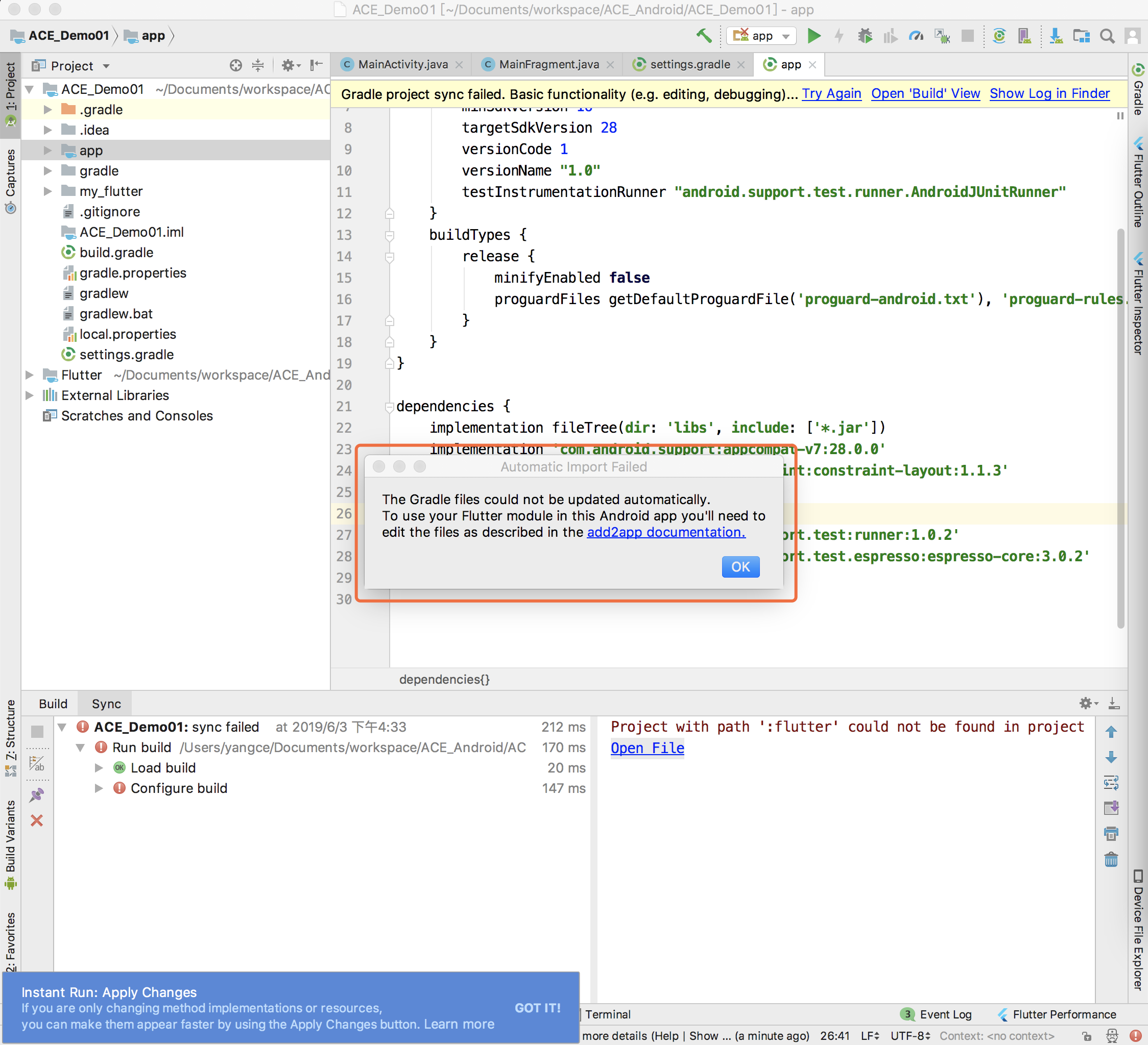 可采用 Flie -> Sync Project with Grdle Files 时,可通过 Import Flutter Module 方式引入;此时若报 The Gradle files could not be updated automatically 则需要手动 3.1 操作;