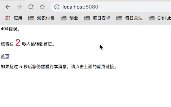 这样我们自定义的错误页面就定义好了,下面给大家讲解我们如何在进入错误页面后,重定向到我们的首页。我们总不能让用户一直看这个错误页面吧。