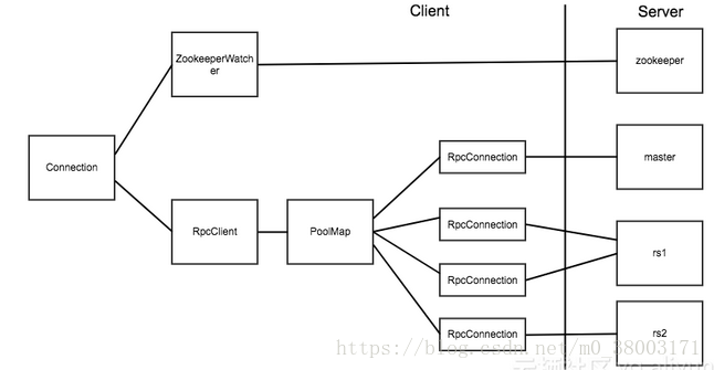 HBase客户端的Connection包含了对以上三种socket连接的封装。Connection对象和实际的socket连接之间的对应关系如下图: