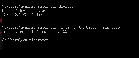 adb -s 127.0.0.1:62001 tcpip 55555