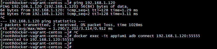 ping 192.168.1.120 docker exec -it appium1 adb connect 192.168.1.120:55555 docker exec -it appium1 adb devices