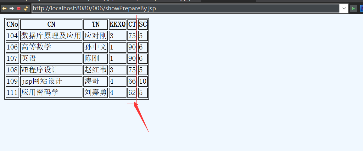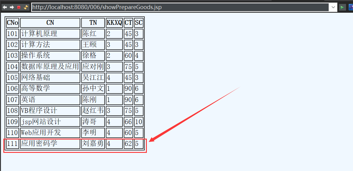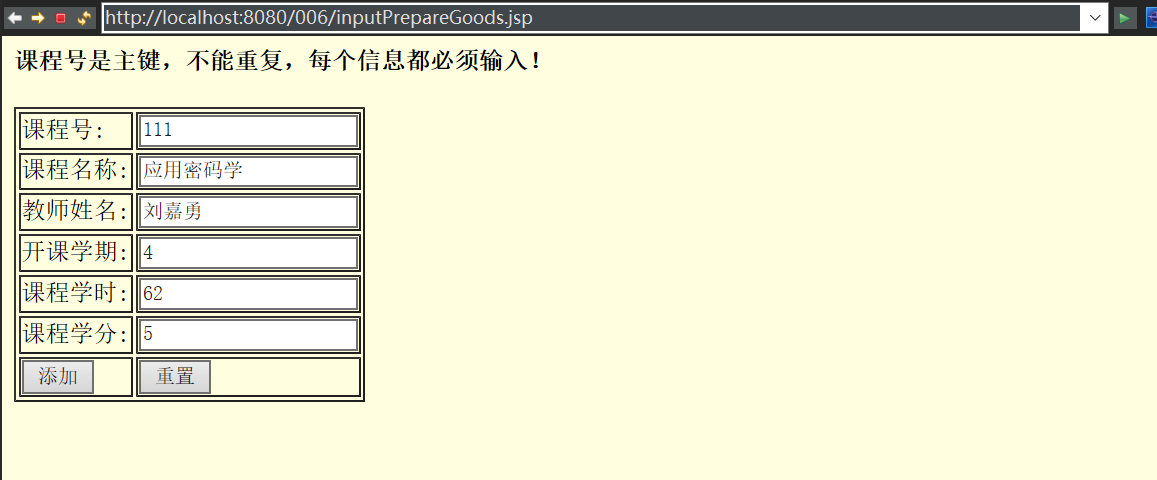 <%@ page language="java" contentType="text/html; charset=GBK" pageEncoding="GBK"%> <html> <head> <title>使用预处理语句</title> </head> <body bgcolor="LightYellow"> <h4>课程号是主键,不能重复,每个信息都必须输入!</h4> <form action="showPrepareGoods.jsp" method="post"> <table border="1"> <tr> <td>课程号:</td> <td><input type="text" name="CNo"/></td> </tr> <tr> <td>课程名称:</td> <td><input type="text" name="CN"/></td> </tr> <tr> <td>教师姓名:</td> <td><input type="text" name="TN"/></td> </tr> <tr> <td>开课学期:</td> <td><input type="text" name="KKXQ"/></td> </tr> <tr> <td>课程学时:</td> <td><input type="text" name="CT"/></td> </tr> <tr> <td>课程学分:</td> <td><input type="text" name="SC"/></td> </tr> <tr> <td><input type="submit" value="添加"></td> <td><input type="reset" value="重置"></td> </tr> </table> </form> </body> </html>