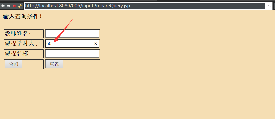 <%@ page language="java" contentType="text/html; charset=GBK" pageEncoding="GBK"%> <html> <head> <title>使用预处理查询</title> </head> <body bgcolor="Wheat"> <h4>输入查询条件!</h4> <form action="showPrepareBy.jsp" method="post"> <table border="1"> <tr> <td>教师姓名:</td> <td><input type="text" name="TN"/></td> </tr> <tr> <td>课程学时大于:</td> <td><input type="text" name="CT"/></td> </tr> <tr> <td>课程名称:</td> <td><input type="text" name="CN"/></td> </tr> <tr> <td><input type="submit" value="查询"></td> <td><input type="reset" value="重置"></td> </tr> </table> </form> </body> </html>