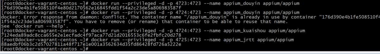 docker run --privileged -d -p 4723:4723 --name appium_douyin appium/appium docker run --privileged -d -p 4725:4723 --name appium_kuaishou appium/appium docker run --privileged -d -p 4727:4723 --name appium_jrtt appium/appium