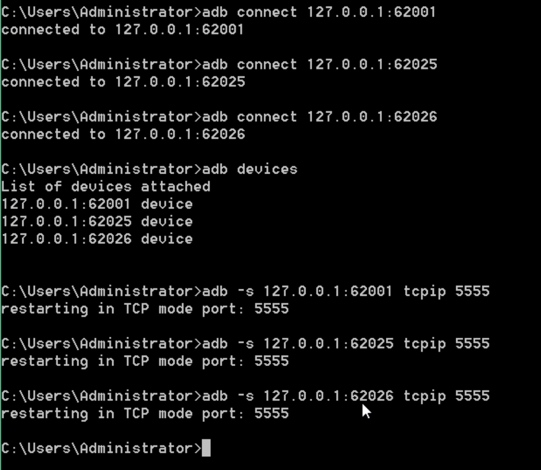 adb connect 127.0.0.1:62001 adb connect 127.0.0.1:62025 adb connect 127.0.0.1:62026 adb devices adb -s 127.0.0.1:62001 tcpip 5555 adb -s 127.0.0.1:62025 tcpip 5555 adb -s 127.0.0.1:62026 tcpip 5555
