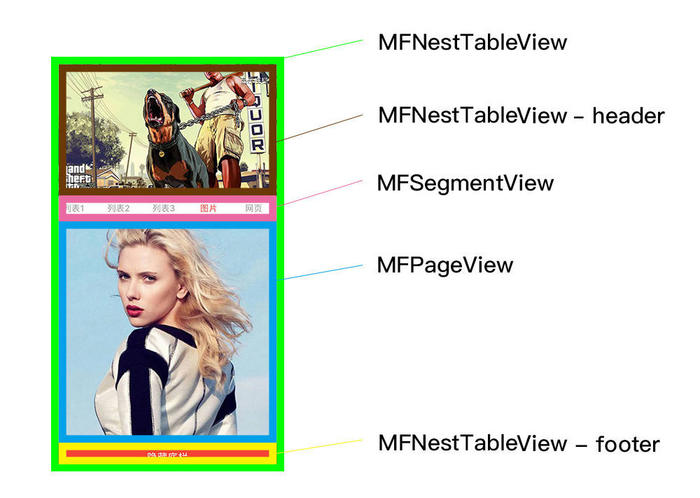 结合上面的动画,可以看到,MFNestTableView 部分可以上下滑动, MFPageView 部分可以左右滑动, 当 MFSegmentView 固定到顶部后, MFPageView 的内容部分可以单独上下滑动。