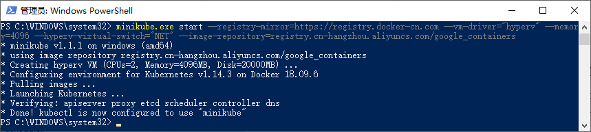 PS C:\WINDOWS\system32> minikube.exe start --registry-mirror=https://registry.docker-cn.com --vm-driver="hyperv" --memory=4096 --hyperv-virtual-switch="NET" --image-repository=registry.cn-hangzhou.aliyuncs.com/google_containers