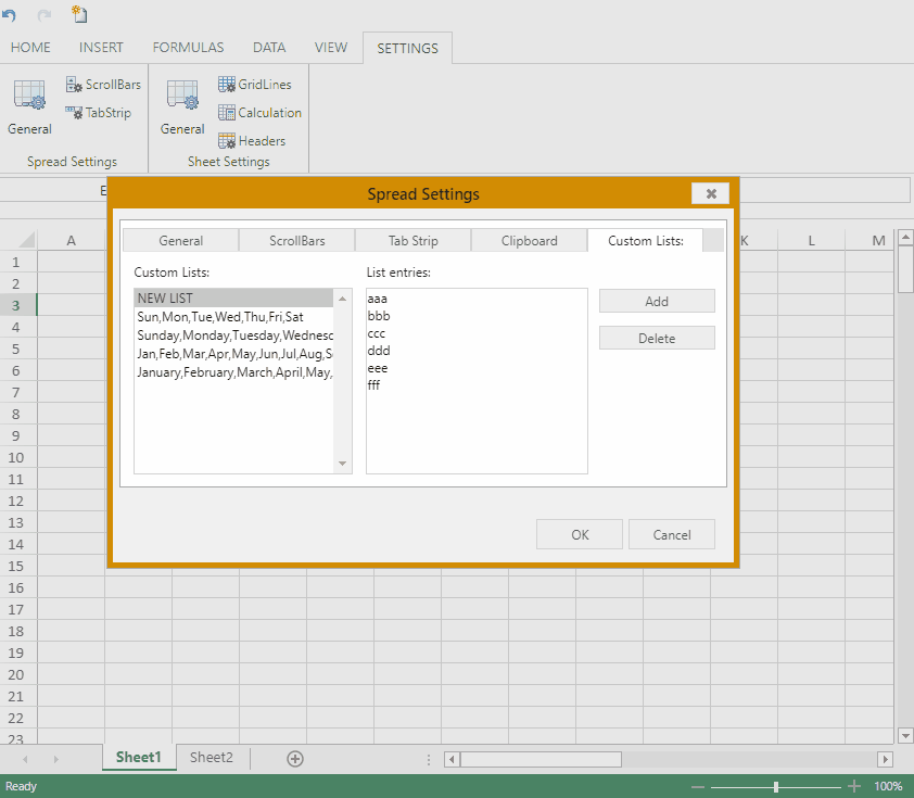 设计器 – 自定义填充。Spread 设计器可以为自动填充或拖动填充设置自定义列表。用户可以根据自定义列表,实现不同的填充效果。在 Spread Setting 中设置这些自定义列表。