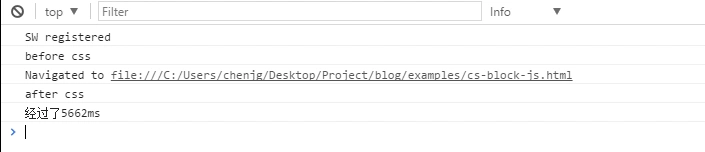 由上图我们可以看到,当css还没加载完成的时候,h1并没有显示,但是此时控制台输出如下