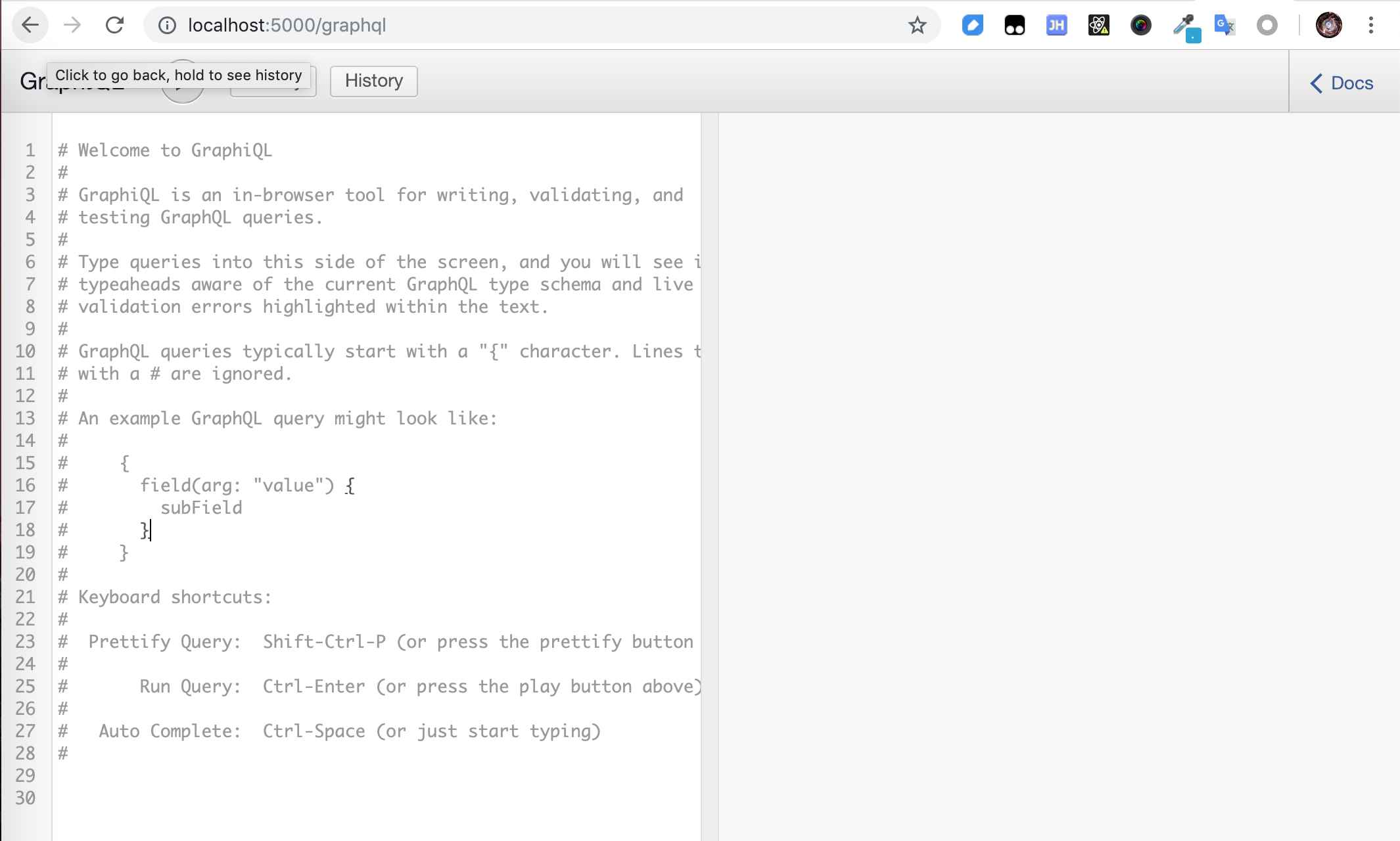 完成这一步,服务端api基本搭建完成!我们看一下效果,在浏览器中输入 http://localhost:5000/graphql 将打开 Graphiql(生产环境建议禁用):