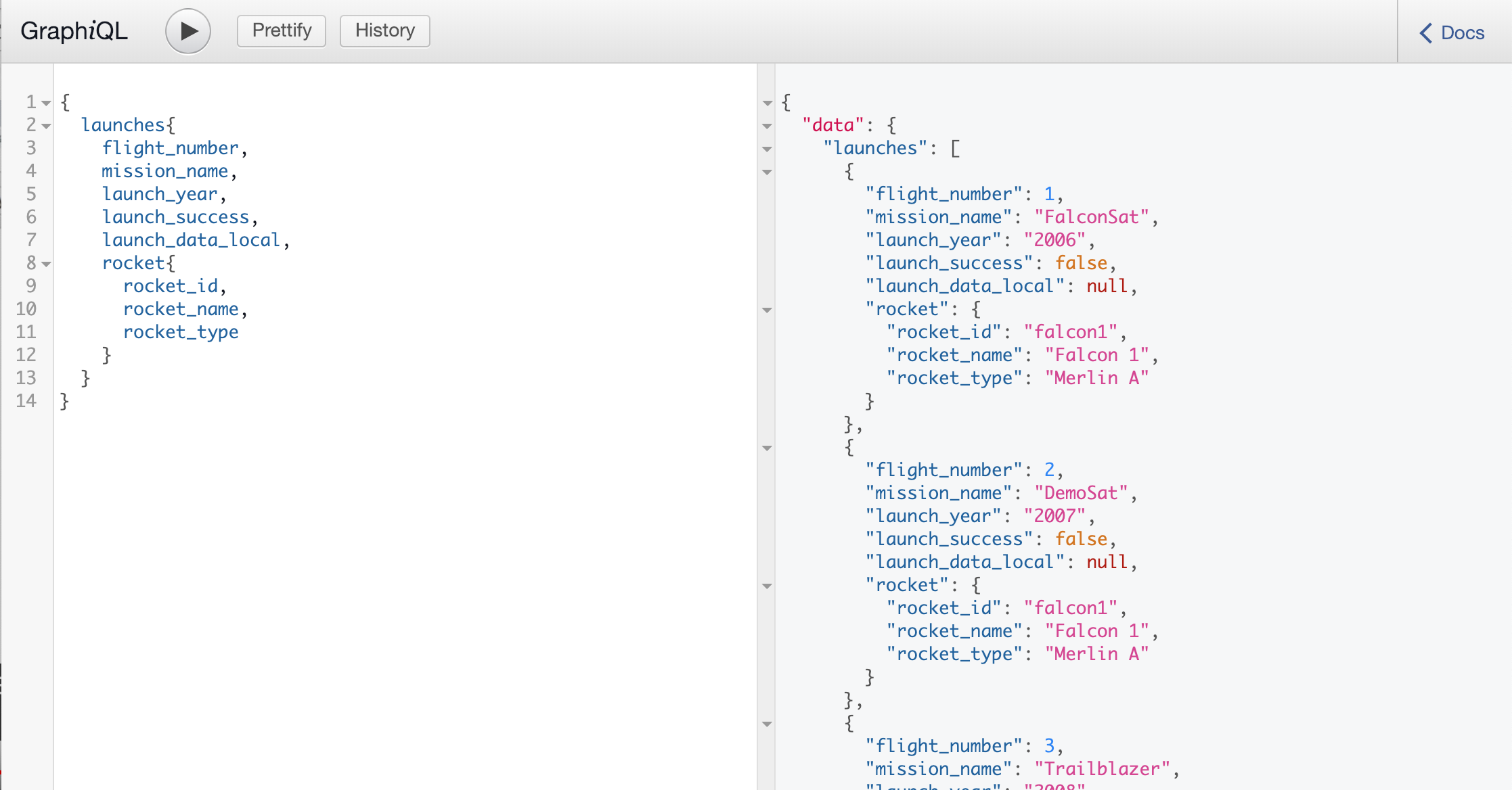 有了数据模型之后,我们需要从数据库或者第三方API获取数据,在此我们从spacex的官方API获取。我们需要定义一个root query,root query做为所有查询的入口,处理并返回数据,更多请参考 GraphQL Root fields & resolvers。