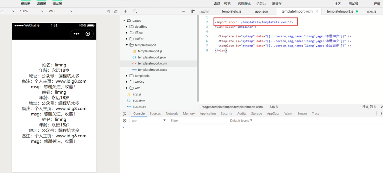 不知道老铁还有印象吗?当时讲模板的时候,是在当前的页面进行模板的应用,如何外部的方式引用模板呢?源码:https://github.com/limingios/wxProgram.git 中的No.8