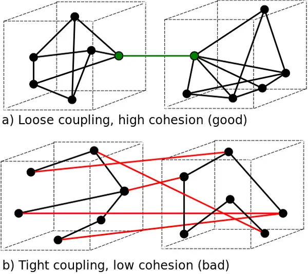 内聚描述模块的元素(命名空间、类、方法、代码块)内聚在一起的程度。凝聚力的测量通常被称为高凝聚力或低内聚。