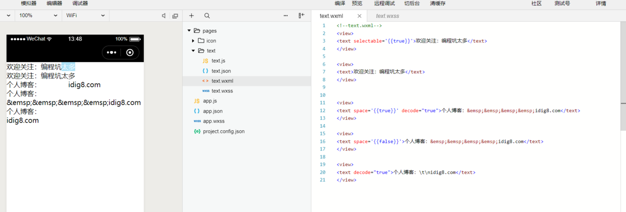 <text space='{{true}}' decode="true">个人博客: idig8.com</text>