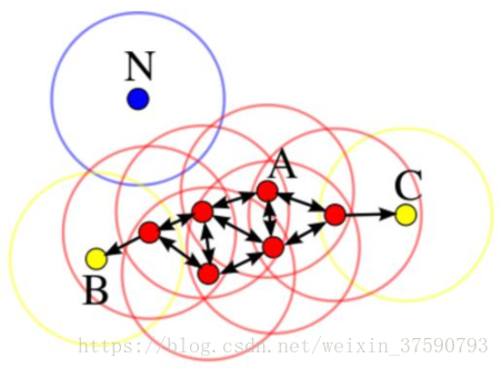 以A点位中心的r-领域内有4个点,所以A为核心点。所有的红色点是密度可达,其中相邻的点是直接密度可达的。B和D是边界点,因为以B,D点为中心其r-领域内的点小于4个点。N点到哪个点都不是密度可达的,所以它是噪声点也就是离群点。