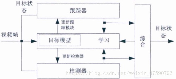 算法首先在初始帧中,手动选取跟踪目标,然后跟踪器和检测器分别进行跟踪,通过综合模块对两者的结果进行综合输出。并且利用学习算法对跟踪器和检测器进行校正。