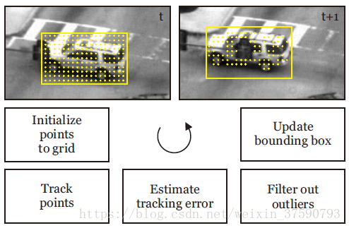 跟踪器的作用是跟踪连续帧间的运动。其工作原理为:利用目标在当前顿的位置估计其在下一帧中的位置,它能够准确跟踪的前提是:目标一直在场景中可见。在TLD算法中,主要用到的是中值光流(Median-Flow)跟踪算法。在进行跟踪前,首先需要选取特征点。TLD跟踪器采用的是光流特征,在选定的跟踪目标框中均匀撒点,最多有10*10共100个特征点。中值光流跟踪算法主要采用以LK光流算法(Lucas-Kanade)进行跟踪,同时利用前后向误差(FB)和特征点前后帧的相似度进行检测和判断。下面是FB误差计算原理图: