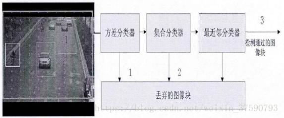 检测器的作用是通过检测方法,在当前帧中搜索目标,找出与目标相似度最大的目标作为本帧的跟踪结果输出。在TLD算法中检测器还具有估计跟踪器误差,如果误差过大,改正跟踪器结果的作用。检测器主要由3个分类器级联而成。这3个分类器分别为;方差分类器,集成分类器和最近邻分类器,这3个分类器是独立运行的。