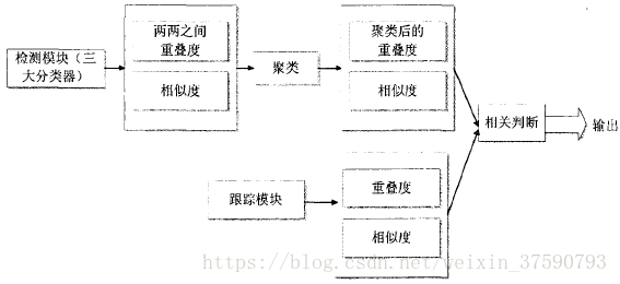 对于综合模块来说,其实就是用跟踪模块和检测模块的结果进行综合考虑,前提是检测器有检测到目标框的结果,对目标框进行聚类得到聚类结果,然后根据跟踪器的结果的情况来分析:如果根据模块跟踪的结果存在,观察跟踪模块与检测模块聚类后的重叠率,如果重叠率低但是检测模块的可信度高,用检测模块聚类后的结果去修正跟踪模块的参数;如果重叠率接近,将跟踪模块的结果和检测模块聚类后加权平均得到当前倾跟踪结果的输出结果,但是跟踪器权重较大;如果跟踪模块没有跟踪到目标框,看检测模块中聚类结果是否只有一个中心,则其为当前帧跟踪结果,如果不只一个中心则将聚类结果丢弃,当前帧没有跟踪到。