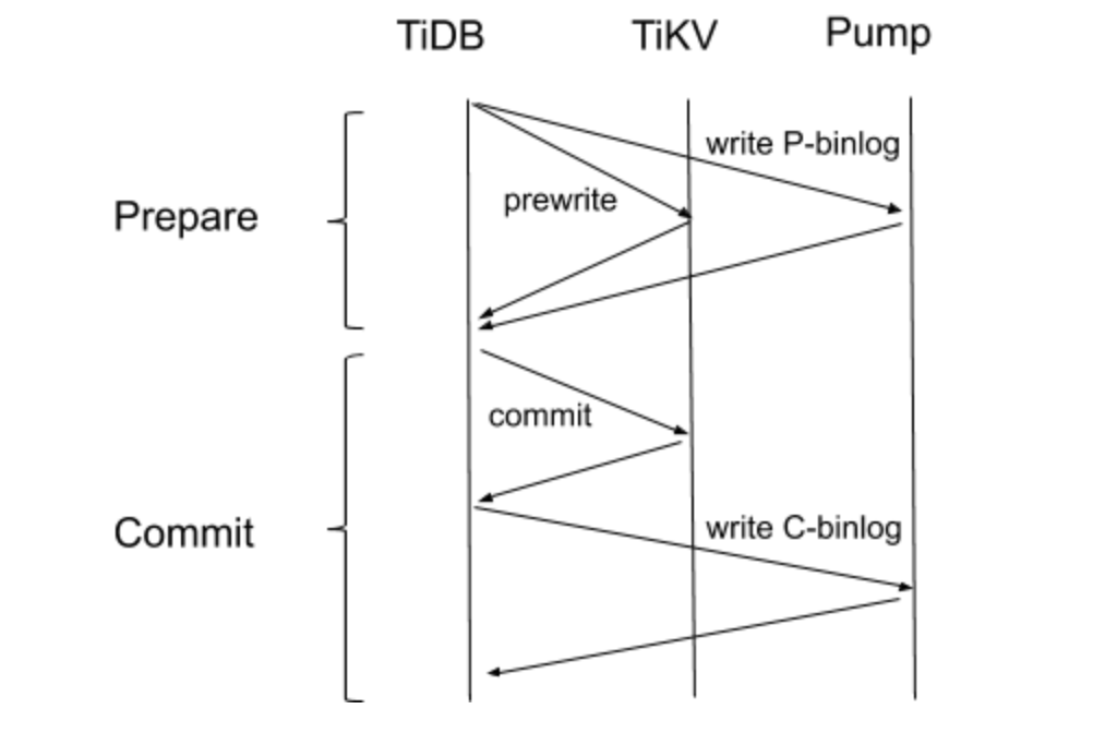 在 Prepare 的阶段,TiDB 会把 Prewrite 的数据发到 TiKV,同时并发写一条 P-binlog 到其中一个 Pump。 两个操作全部成功后才会进行 Commit 阶段,所以我们提交事务时就可以确定 P-binlog 已经成功保存。写 C-binlog 是在 TiKV 提交事务后异步发送的,告诉 Pump 这个事务提交了还是回滚了。