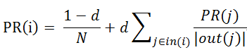 它的基本思想是,假设网页之前通过超链接相互连接,互联网上的所有网页便构成了一张图。用户随机的打开一个网页,并通过超链接跳转到另一个网页。每当用户到达一个网页,他都有两种选择,停留在当前网页或者通过继续访问其他网页。如果用户继续访问网页的概率为d,那么用户停留在当前网页的概率便是1-d。如果用户继续访问其他网页,则会以均匀分布的方式随机访问当前网页指向的另一网页,这是一个随机游走的过程。当用户多次访问网页后,每一个网页被访问到的概率便会收敛到某个值,而计算出来的结果便可以用于网页排名,我们用以下的公式来表示: