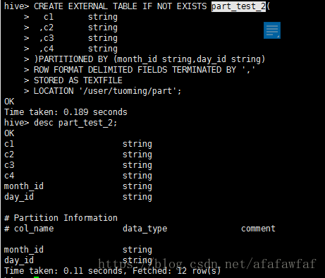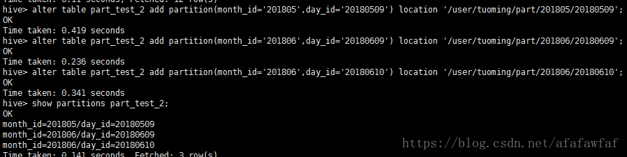 alter table part_test_2 add partition(month_id='201805',day_id='20180509') location '/user/tuoming/part/201805/20180509';