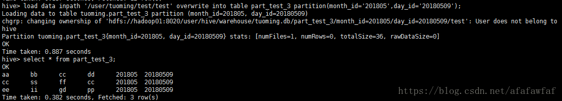 load data inpath '/user/tuoming/test/test' overwrite into table part_test_3 partition(month_id='201805',day_id='20180509');