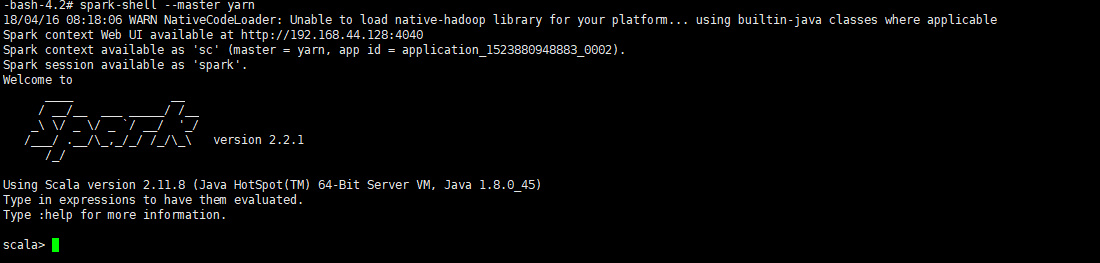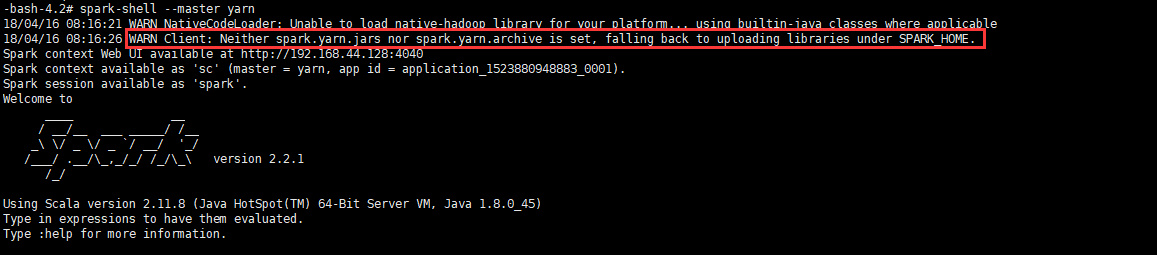 18/04/16 07:59:23 WARN NativeCodeLoader: Unable to load native-hadoop library for your platform... using builtin-java classes where applicable18/04/16 07:59:27 WARN Client: Neither spark.yarn.jars nor spark.yarn.archive is set, falling back to uploading libraries under SPARK_HOME.18/04/16 07:59:54 ERROR SparkContext: Error initializing SparkContext. org.apache.spark.SparkException: Yarn application has already ended! It might have been killed or unable to launch application master. at org.apache.spark.scheduler.cluster.YarnClientSchedulerBackend.waitForApplication(YarnClientSchedulerBackend.scala:85) at org.apache.spark.scheduler.cluster.YarnClientSchedulerBackend.start(YarnClientSchedulerBackend.scala:62) at org.apache.spark.scheduler.TaskSchedulerImpl.start(TaskSchedulerImpl.scala:173) at org.apache.spark.SparkContext.<init>(SparkContext.scala:509) at org.apache.spark.SparkContext$.getOrCreate(SparkContext.scala:2516) at org.apache.spark.sql.SparkSession$Builder$$anonfun$6.apply(SparkSession.scala:918) at org.apache.spark.sql.SparkSession$Builder$$anonfun$6.apply(SparkSession.scala:910) at scala.Option.getOrElse(Option.scala:121) at org.apache.spark.sql.SparkSession$Builder.getOrCreate(SparkSession.scala:910) at org.apache.spark.repl.Main$.createSparkSession(Main.scala:101) at $line3.$read$$iw$$iw.<init>(<console>:15) at $line3.$read$$iw.<init>(<console>:42) at $line3.$read.<init>(<console>:44) at $line3.$read$.<init>(<console>:48) at $line3.$read$.<clinit>(<console>) at $line3.$eval$.$print$lzycompute(<console>:7) at $line3.$eval$.$print(<console>:6) at $line3.$eval.$print(<console>) at sun.reflect.NativeMethodAccessorImpl.invoke0(Native Method) at sun.reflect.NativeMethodAccessorImpl.invoke(NativeMethodAccessorImpl.java:62) at sun.reflect.DelegatingMethodAccessorImpl.invoke(DelegatingMethodAccessorImpl.java:43) at java.lang.reflect.Method.invoke(Method.java:497) at scala.tools.nsc.interpreter.IMain$ReadEvalPrint.call(IMain.scala:786) at scala.tools.nsc.interpreter.IMain$Request.loadAndRun(IMain.scala:1047) at scala.tools.nsc.interpreter.IMain$WrappedRequest$$anonfun$loadAndRunReq$1.apply(IMain.scala:638) at scala.tools.nsc.interpreter.IMain$WrappedRequest$$anonfun$loadAndRunReq$1.apply(IMain.scala:637) at scala.reflect.internal.util.ScalaClassLoader$class.asContext(ScalaClassLoader.scala:31) at scala.reflect.internal.util.AbstractFileClassLoader.asContext(AbstractFileClassLoader.scala:19) at scala.tools.nsc.interpreter.IMain$WrappedRequest.loadAndRunReq(IMain.scala:637) at scala.tools.nsc.interpreter.IMain.interpret(IMain.scala:569) at scala.tools.nsc.interpreter.IMain.interpret(IMain.scala:565) at scala.tools.nsc.interpreter.ILoop.interpretStartingWith(ILoop.scala:807) at scala.tools.nsc.interpreter.ILoop.command(ILoop.scala:681) at scala.tools.nsc.interpreter.ILoop.processLine(ILoop.scala:395) at org.apache.spark.repl.SparkILoop$$anonfun$initializeSpark$1.apply$mcV$sp(SparkILoop.scala:38) at org.apache.spark.repl.SparkILoop$$anonfun$initializeSpark$1.apply(SparkILoop.scala:37) at org.apache.spark.repl.SparkILoop$$anonfun$initializeSpark$1.apply(SparkILoop.scala:37) at scala.tools.nsc.interpreter.IMain.beQuietDuring(IMain.scala:214) at org.apache.spark.repl.SparkILoop.initializeSpark(SparkILoop.scala:37) at org.apache.spark.repl.SparkILoop.loadFiles(SparkILoop.scala:98) at scala.tools.nsc.interpreter.ILoop$$anonfun$process$1.apply$mcZ$sp(ILoop.scala:920) at scala.tools.nsc.interpreter.ILoop$$anonfun$process$1.apply(ILoop.scala:909) at scala.tools.nsc.interpreter.ILoop$$anonfun$process$1.apply(ILoop.scala:909) at scala.reflect.internal.util.ScalaClassLoader$.savingContextLoader(ScalaClassLoader.scala:97) at scala.tools.nsc.interpreter.ILoop.process(ILoop.scala:909) at org.apache.spark.repl.Main$.doMain(Main.scala:74) at org.apache.spark.repl.Main$.main(Main.scala:54) at org.apache.spark.repl.Main.main(Main.scala) at sun.reflect.NativeMethodAccessorImpl.invoke0(Native Method) at sun.reflect.NativeMethodAccessorImpl.invoke(NativeMethodAccessorImpl.java:62) at sun.reflect.DelegatingMethodAccessorImpl.invoke(DelegatingMethodAccessorImpl.java:43) at java.lang.reflect.Method.invoke(Method.java:497) at org.apache.spark.deploy.SparkSubmit$.org$apache$spark$deploy$SparkSubmit$$runMain(SparkSubmit.scala:775) at org.apache.spark.deploy.SparkSubmit$.doRunMain$1(SparkSubmit.scala:180) at org.apache.spark.deploy.SparkSubmit$.submit(SparkSubmit.scala:205) at org.apache.spark.deploy.SparkSubmit$.main(SparkSubmit.scala:119) at org.apache.spark.deploy.SparkSubmit.main(SparkSubmit.scala)18/04/16 07:59:54 WARN YarnSchedulerBackend$YarnSchedulerEndpoint: Attempted to request executors before the AM has registered!18/04/16 07:59:54 WARN MetricsSystem: Stopping a MetricsSystem that is not running org.apache.spark.SparkException: Yarn application has already ended! It might have been killed or unable to launch application master. at org.apache.spark.scheduler.cluster.YarnClientSchedulerBackend.waitForApplication(YarnClientSchedulerBackend.scala:85) at org.apache.spark.scheduler.cluster.YarnClientSchedulerBackend.start(YarnClientSchedulerBackend.scala:62) at org.apache.spark.scheduler.TaskSchedulerImpl.start(TaskSchedulerImpl.scala:173) at org.apache.spark.SparkContext.<init>(SparkContext.scala:509) at org.apache.spark.SparkContext$.getOrCreate(SparkContext.scala:2516) at org.apache.spark.sql.SparkSession$Builder$$anonfun$6.apply(SparkSession.scala:918) at org.apache.spark.sql.SparkSession$Builder$$anonfun$6.apply(SparkSession.scala:910) at scala.Option.getOrElse(Option.scala:121) at org.apache.spark.sql.SparkSession$Builder.getOrCreate(SparkSession.scala:910) at org.apache.spark.repl.Main$.createSparkSession(Main.scala:101) ... 47 elided <console>:14: error: not found: value spark import spark.implicits._ ^ <console>:14: error: not found: value spark import spark.sql ^ Welcome to ____ __ / __/__ ___ _____/ /__ _\ \/ _ \/ _ `/ __/ '_/ /___/ .__/\_,_/_/ /_/\_\ version 2.2.1 /_/ Using Scala version 2.11.8 (Jav