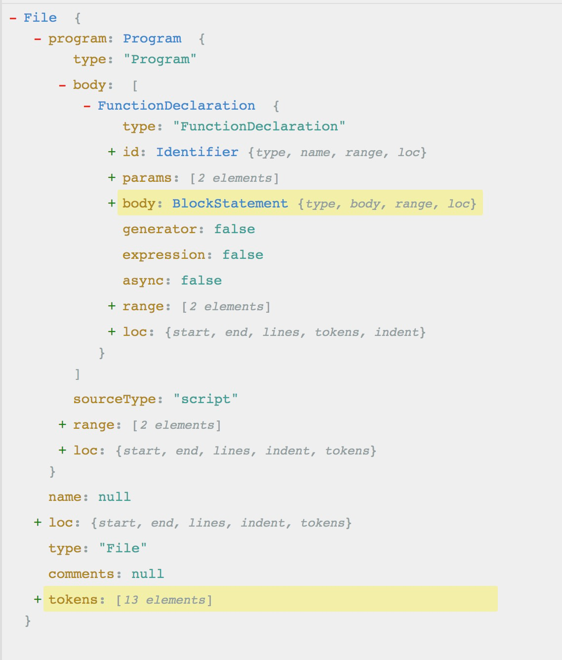 上图中的 FunctionDeclaration、Identifier、BlockStatement 等这些代码块的类型的说明请点击链接自行查看:AST 对象文档