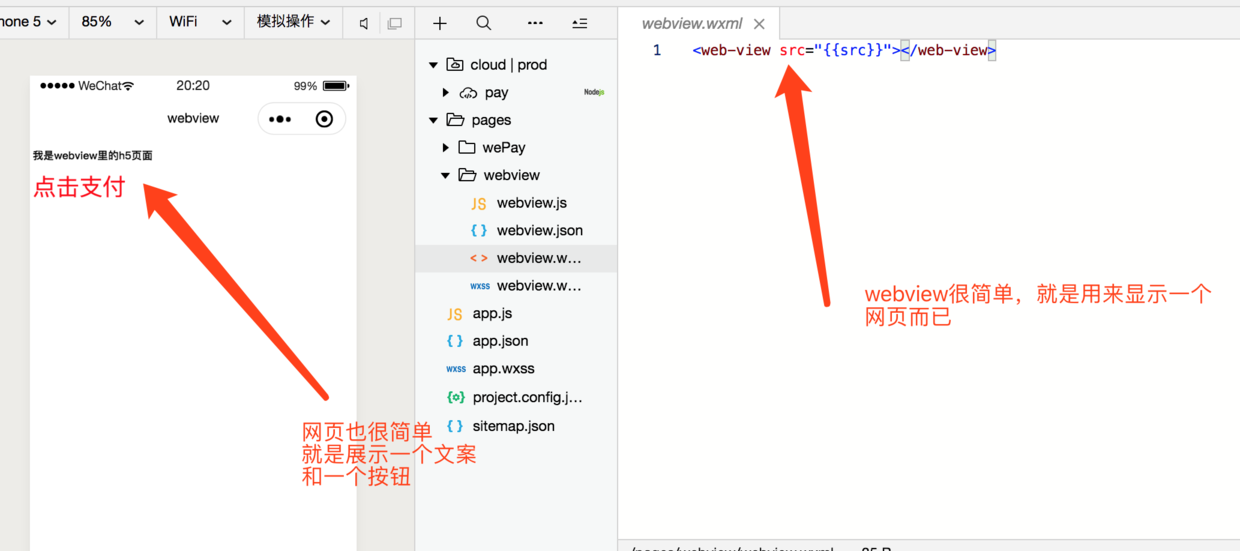小程序支持webview以后,我们开发的好多h5页面,就可以直接在小程序里使用了,比如我们开发的微信商城,文章详情页,商品详情页,就可以开发一套,多处使用了。我们今天来讲一讲。在小程序的webview里实现微信支付功能。因为微信不允许在小程序的webview里直接调起微信支付。所以我们这节课就要涉及到小程序和webview的交互了。