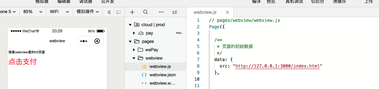接下来我们在小程序的webview里显示这个页面,也很简单,只需要把我们的src定义为我们的本地网页链接就可以了。