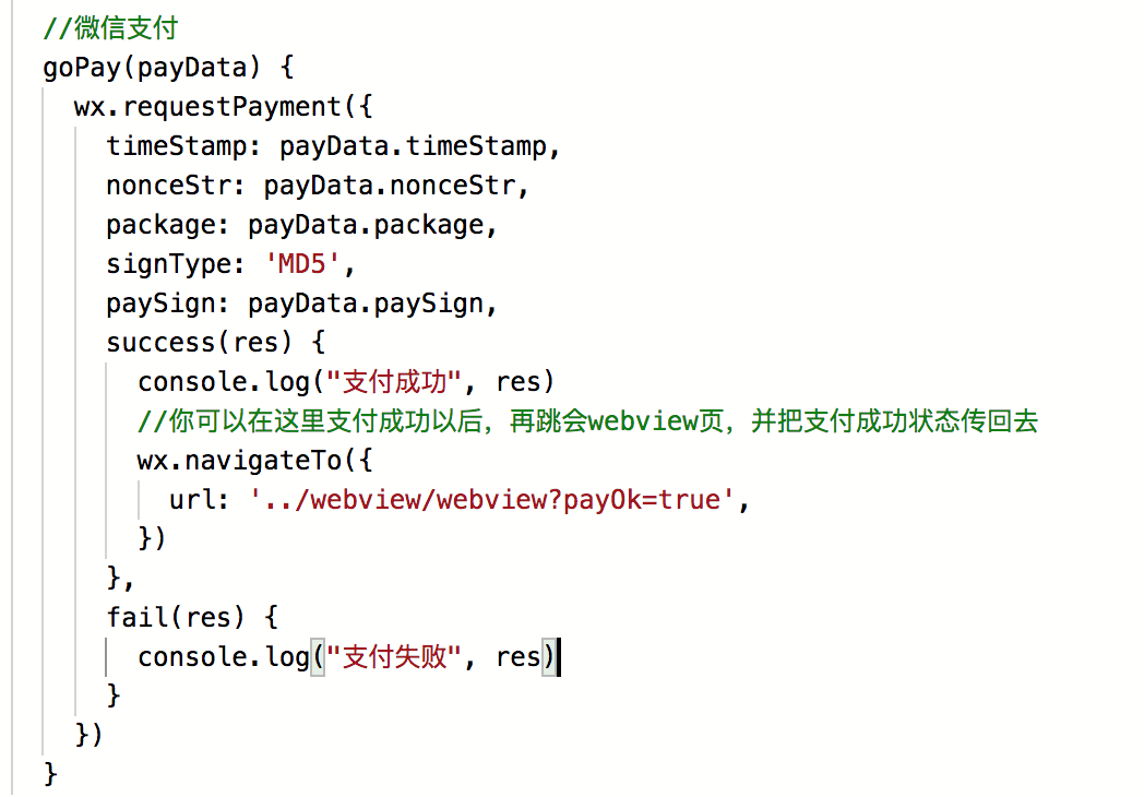 let payDataStr = JSON.stringify(payData);//因为要吧参数传递给小程序,所以这里需要转为字符串