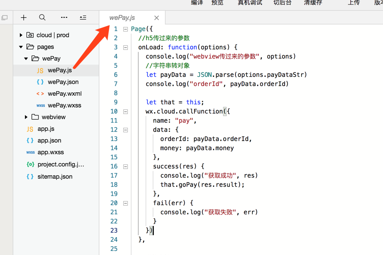 小程序支付页功能很简单,就是来接收我们h5传过订单号和订单金额。然后去调起微信支付,实现支付。支付成功和支付失败都有对应的回调。